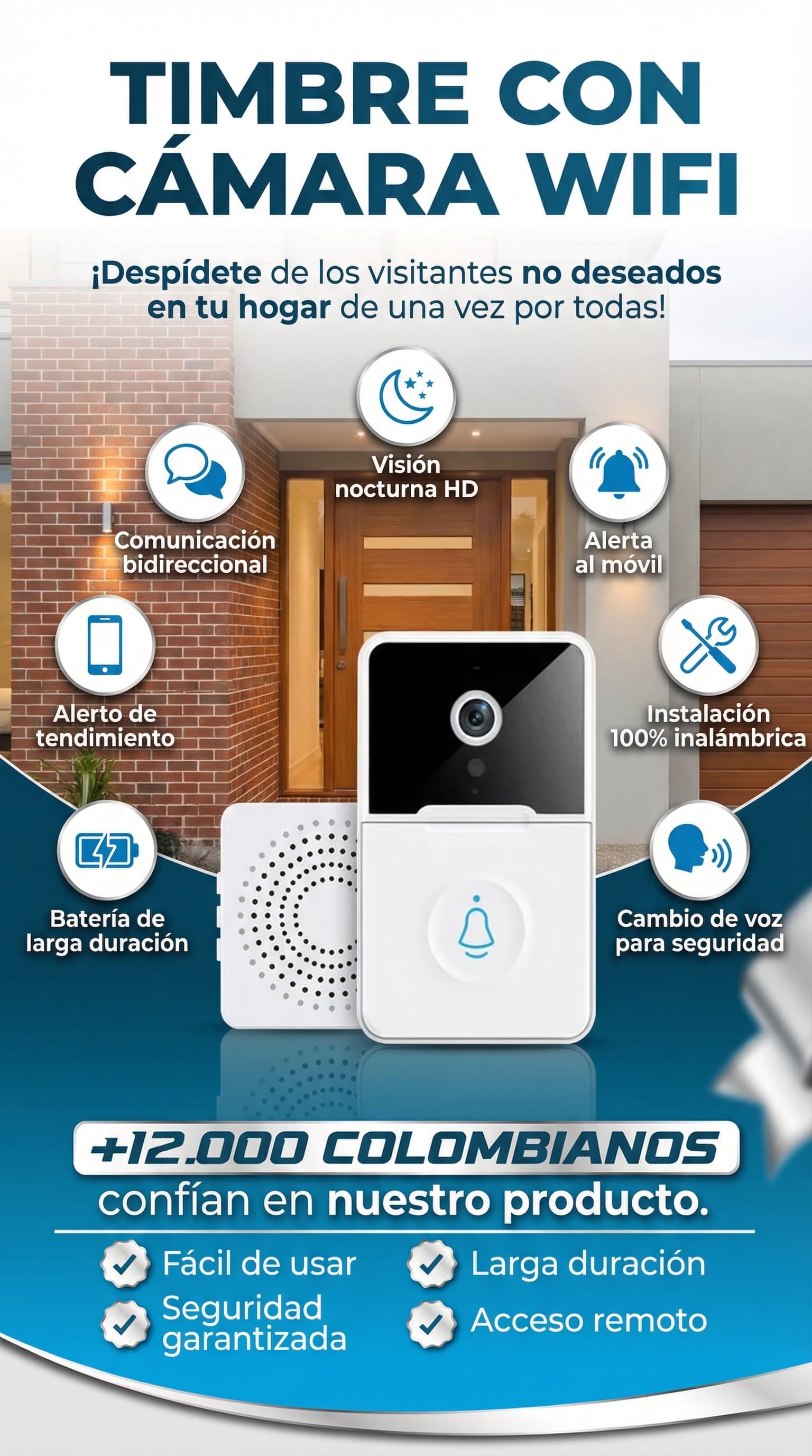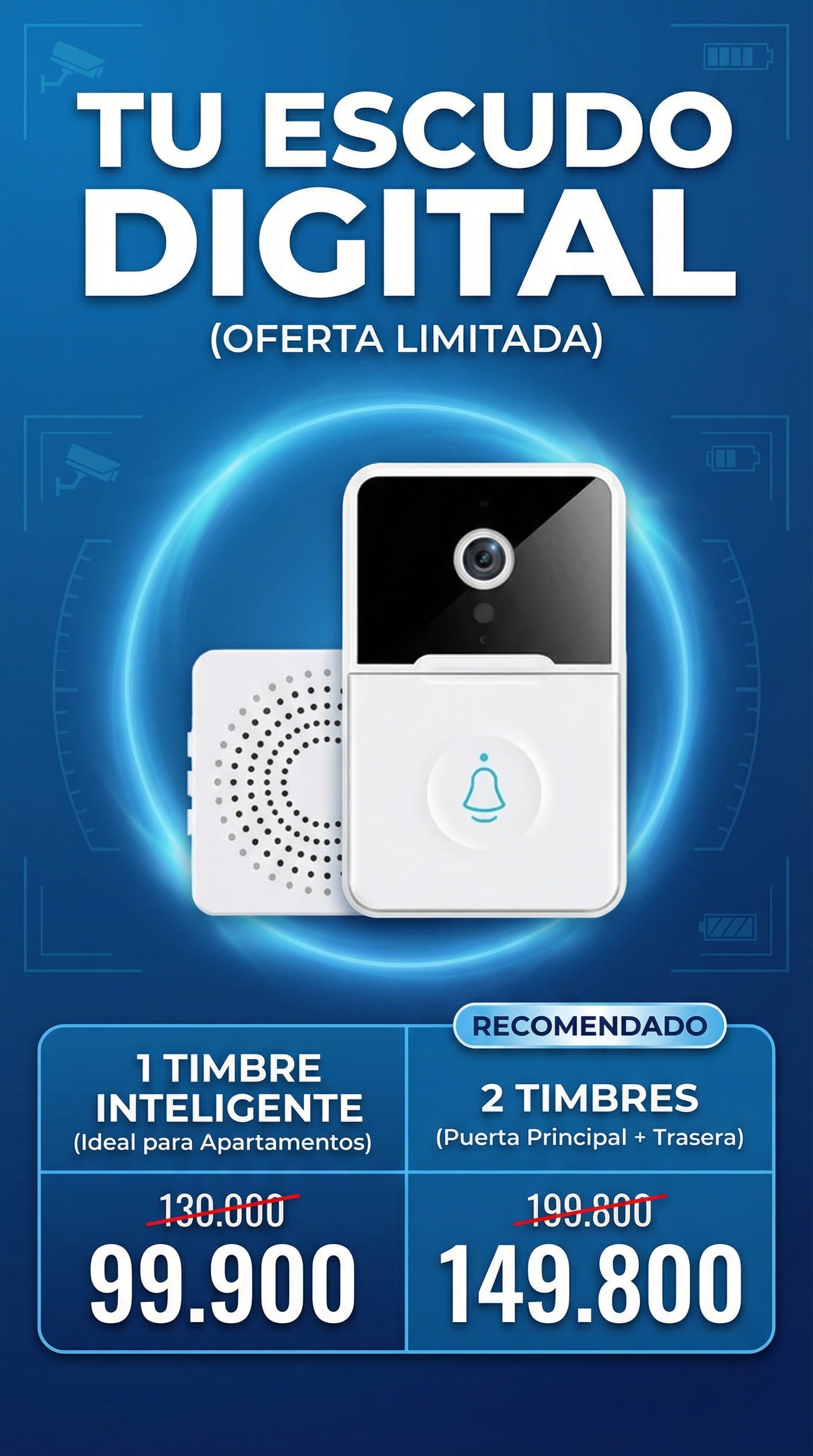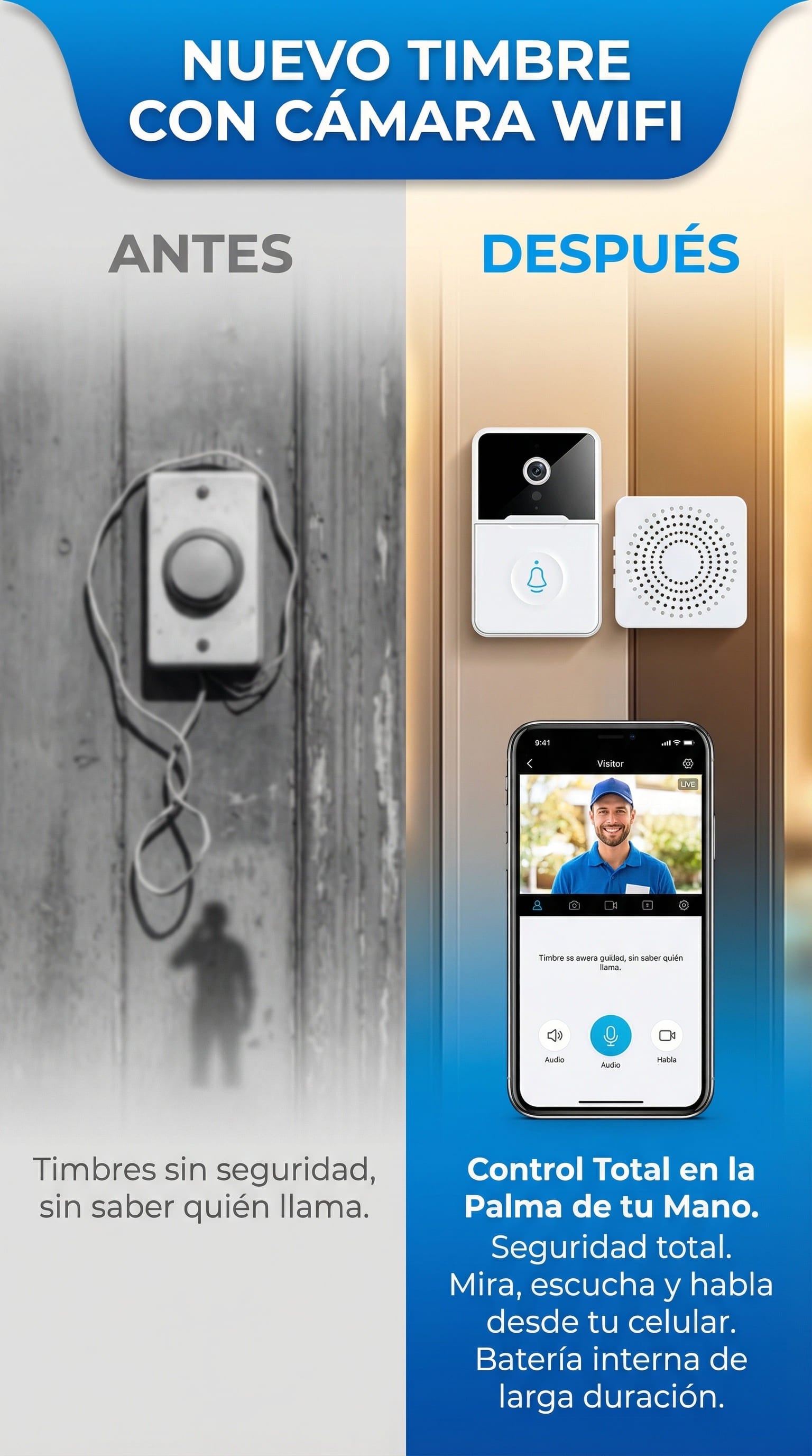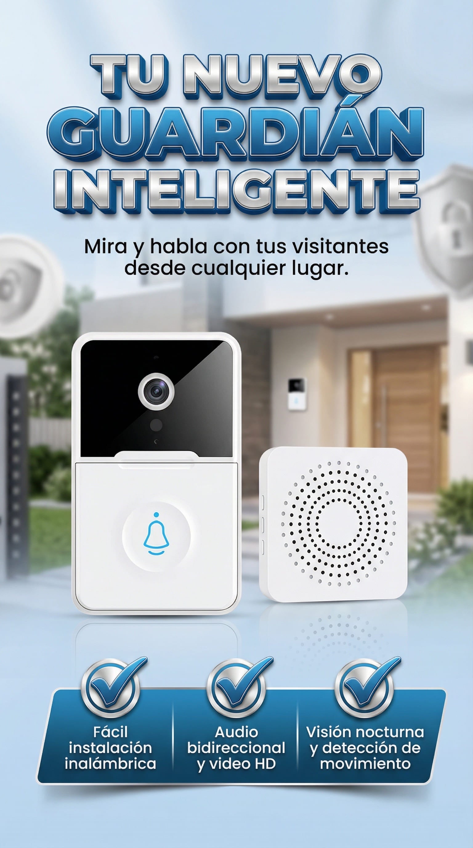 Es un sistema de seguridad inteligente 1080P Full HD. Cuando alguien toca el timbre, recibes una notificación instantánea en tu celular. Puedes ver, escuchar y hablar con tus visitantes en tiempo real desde cualquier lugar a través de la App.